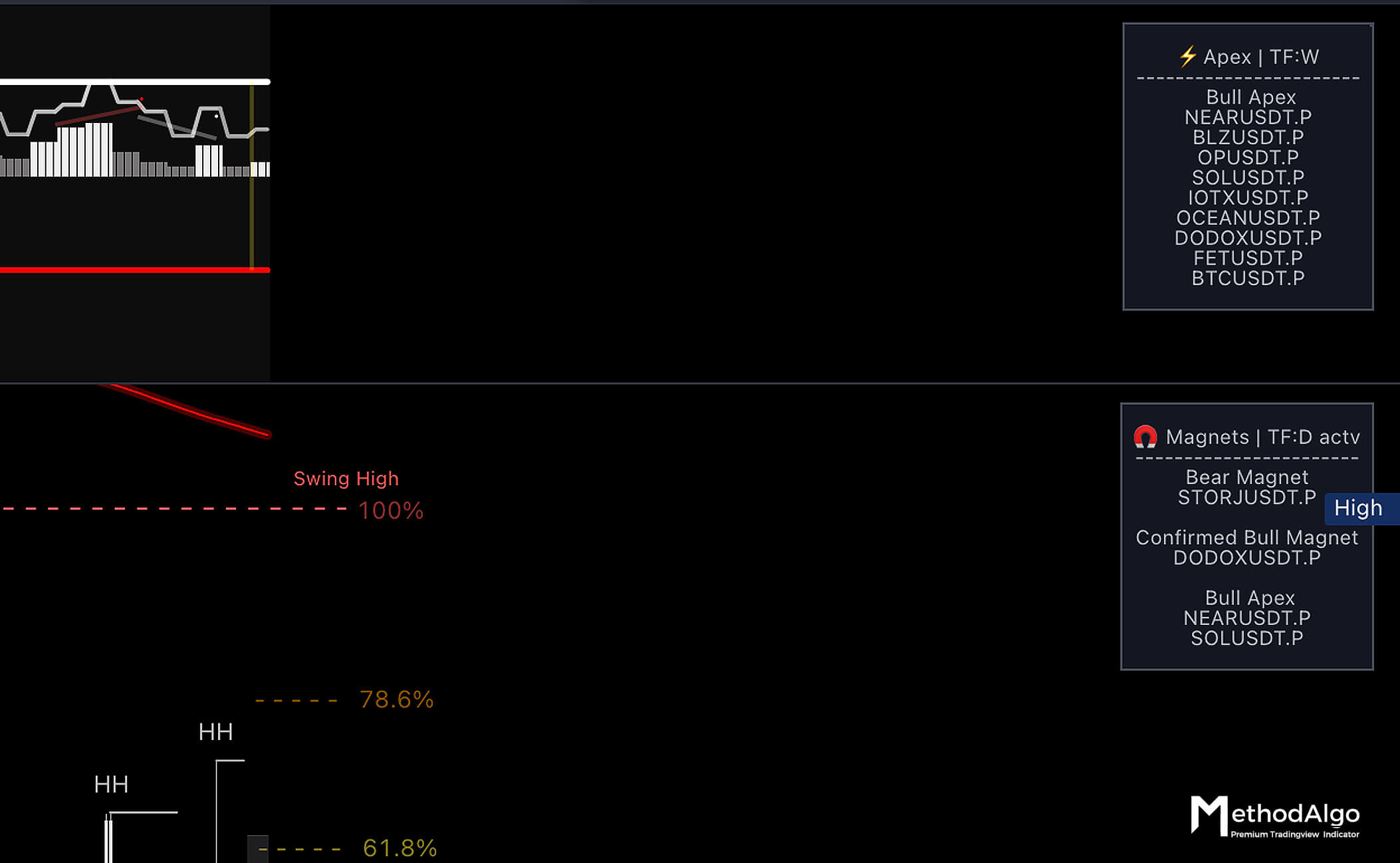 chart timeframefor Magnet and Apex status. This drone updates according to the current timeframe of the chart which is the dynamic option. - Bottom-right corner: Monitors the