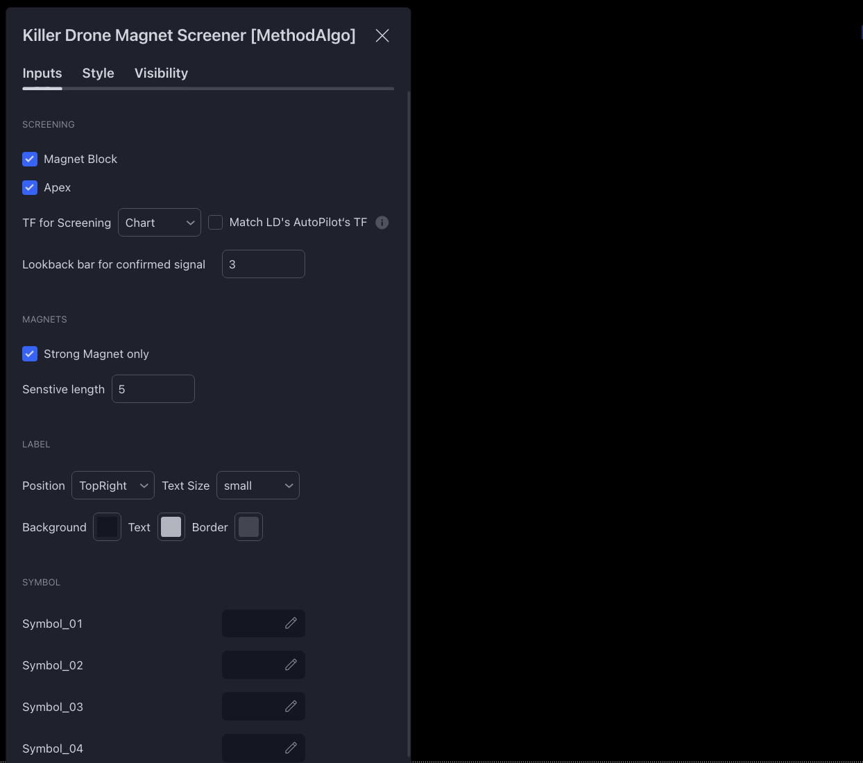 Screening: Choose the signals to monitor, Magnet Blocks and Apex.TF for screening: Customizable timeframe for monitoring.Match LD's Autopilot TF: Enable only when replacing the built-in Apex filter in Liquidity Detective to align with the Detective's auto data timeframe.Lookback for confirmed signal: Determines how many candles after a signal is generated it will remain visible on the panel.Strong Magnet: Enable to filter out weaker magnets.Sensitive: Sensitivity of magnet monitoring.Position, Text Size, Color: Position of the panel, text size, and color.Symbol01-25: Customize the assets to monitor.