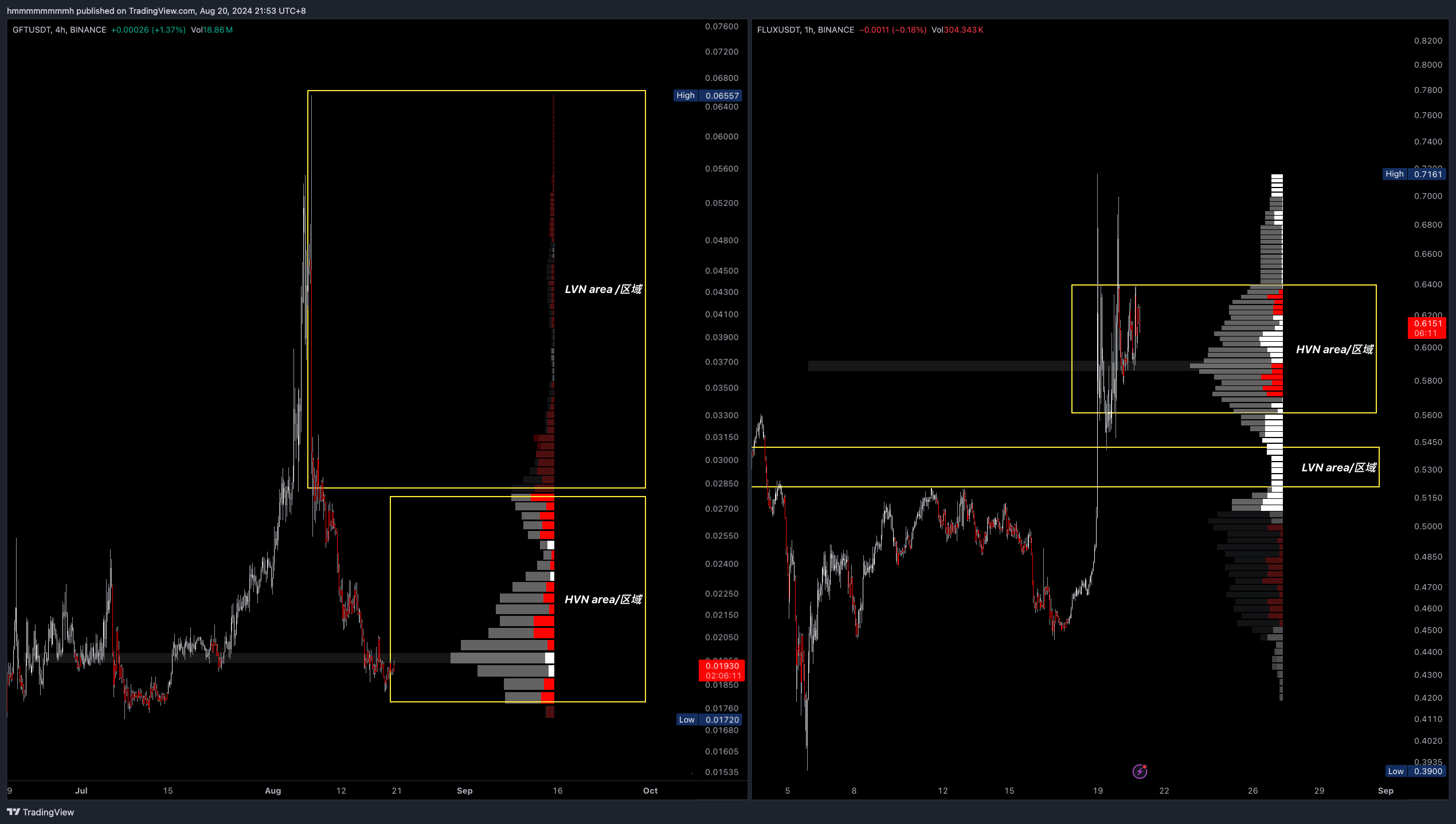 Example: Left: GFTUSDT fails to accumulate sufficient volume after breaking through the LVN and returns to the VA POC. Right: FLUXUSDT accumulates new volume after breaking through the LVN, forming a new VA and POC, predicting that it will not return to the low level like GFT.