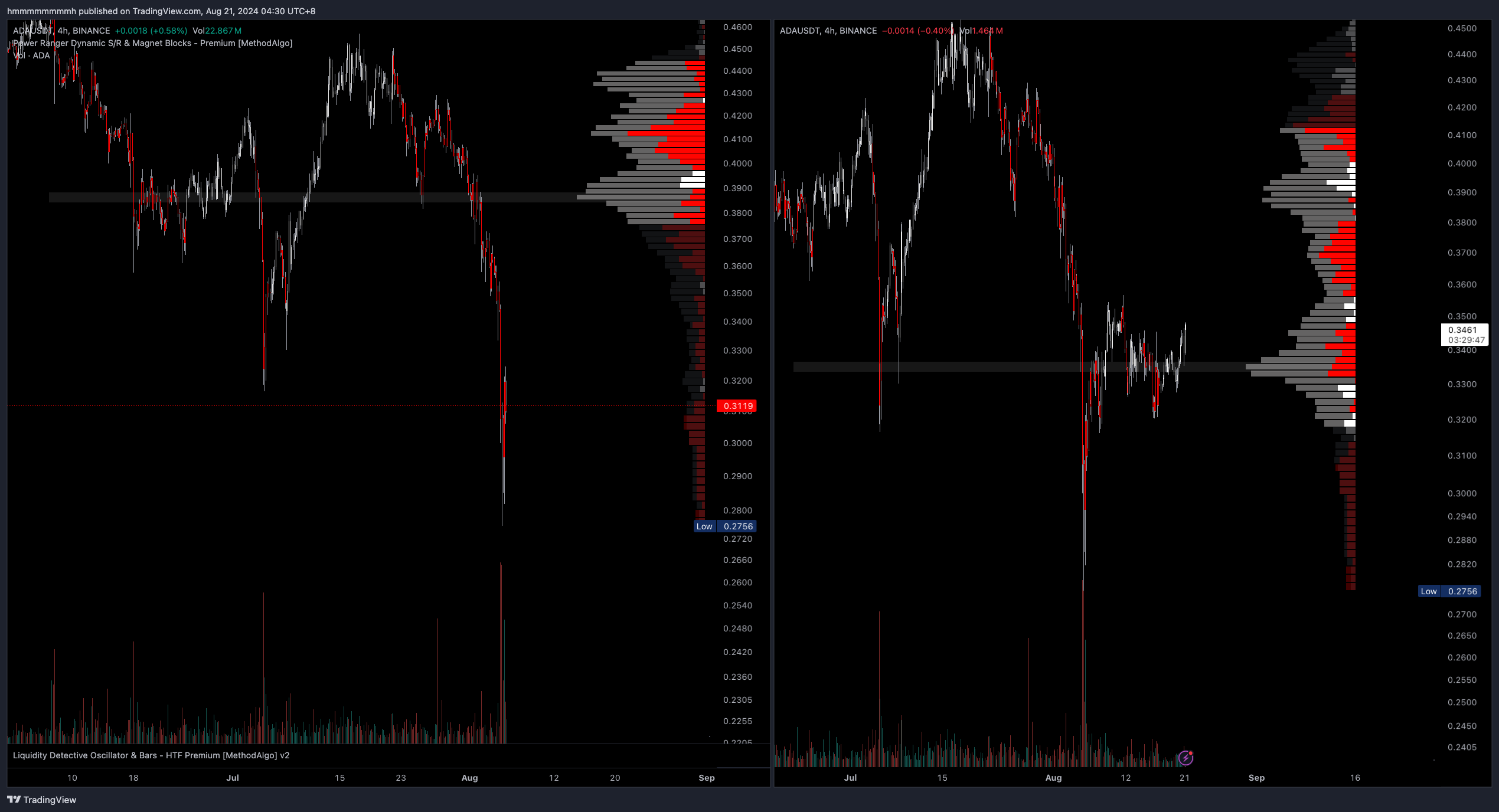 In the chart of ADAUSDT, the left side shows a capitulation candle, and the right side shows the subsequent price movement after capitulation: