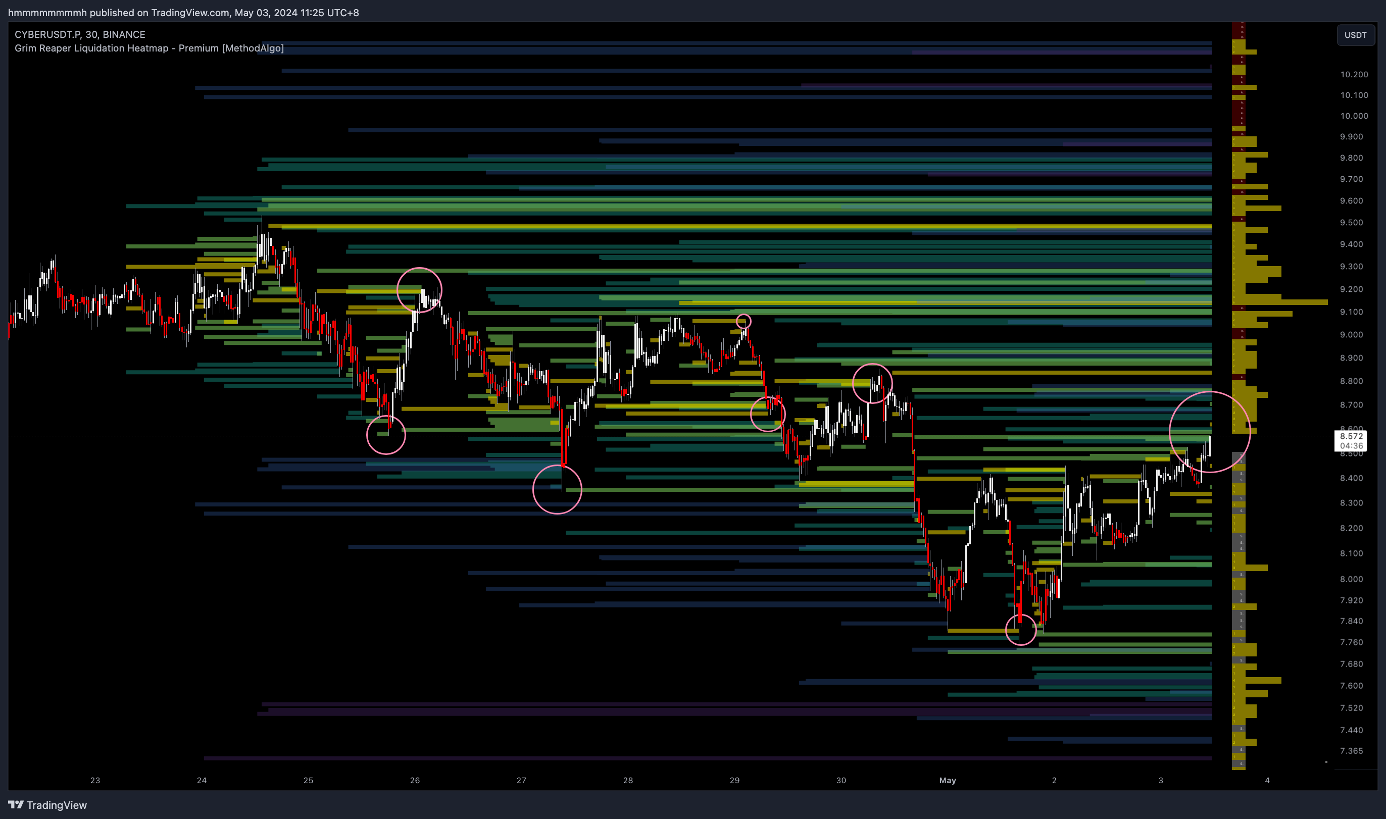 MethodAlgo的高级指标Grim Reaper(死神)清算热力图是一种用于预测可能发生的大规模清算事件价格位置的指标。 在热图的帮助下,您可以快速掌握市场信任的价格水平,让您对市场情绪的变化做出快速反应。像地图一样阅读流动性,并找到更好的交易机会。 该算法依据交易所的大数据信息(Open Interest,O.I)数据,通过时间加权推算出不同杠杆水平下可能导致爆仓的价格位置,并预测可能发生的大规模清算价格范围。该指标旨在帮助交易者找到最佳的高流动性交易位置。 Grim Reaper根据5个不同杠杆等级(5x、10x、25x、50x、100x)进行估算,并以不同的颜色(从冷色紫到热色黄)表示不同等级,交易者可通过线条密度和颜色来辨识高流动性区域