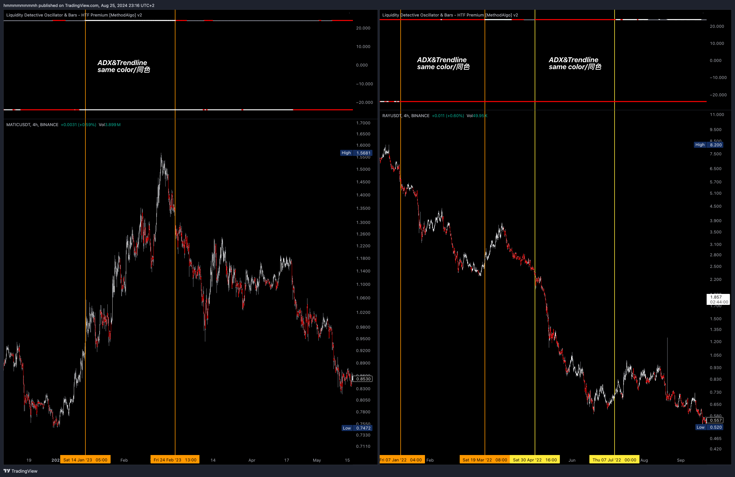 下图示例展示了流动性侦探已经帮你计算了ADX给出的各种信号,并通过颜色视觉化,且数据与ADX准确度相同