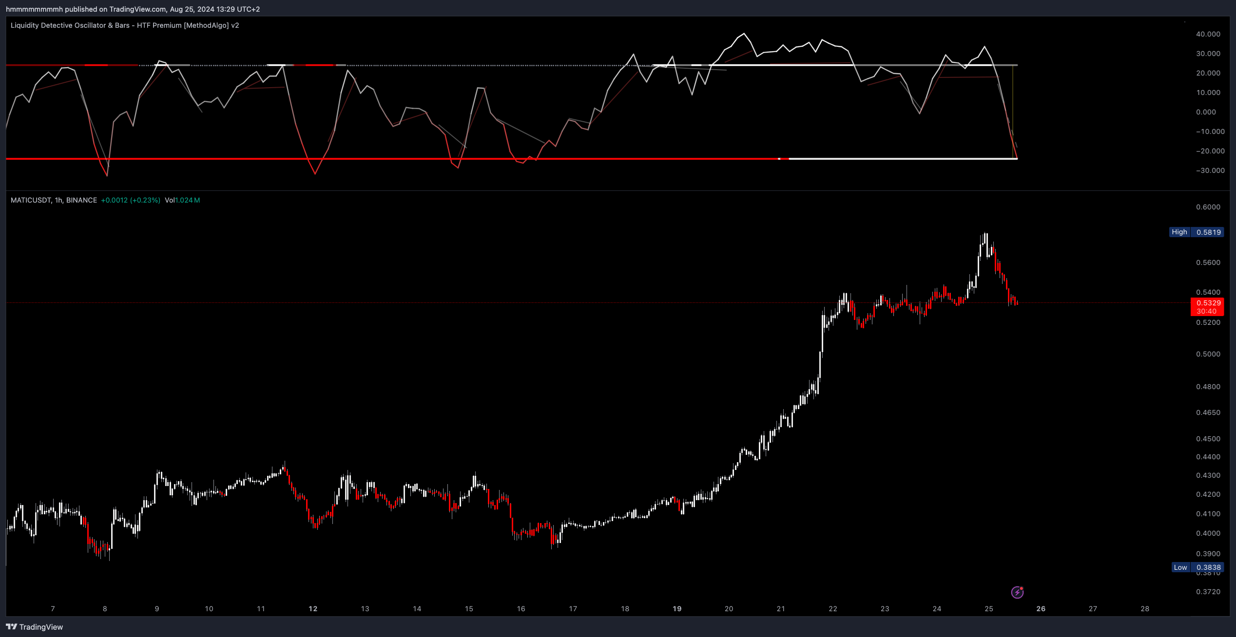 下图示例展示了,流动性侦探的趋势线与超能战队指标的趋势线相同