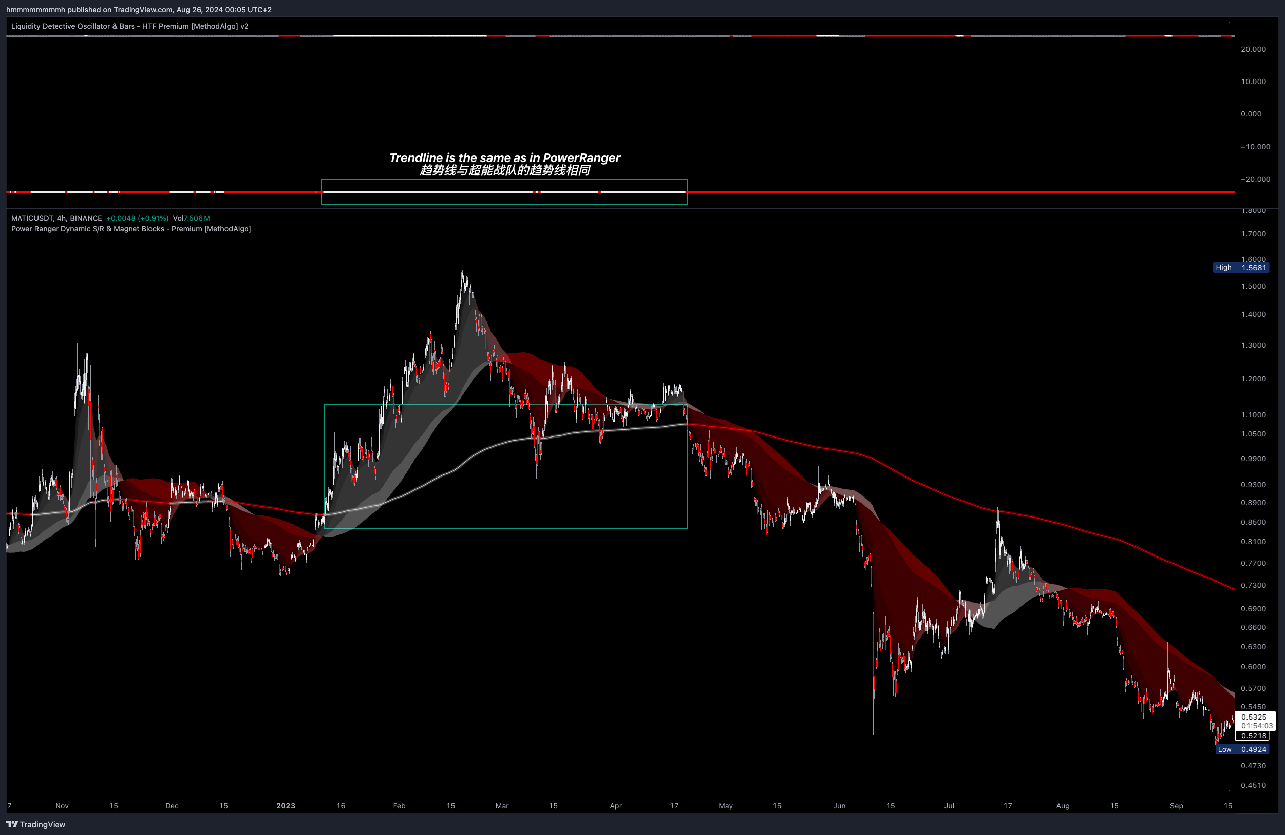 下图示例展示了,流动性侦探的趋势线与超能战队指标的趋势线相同