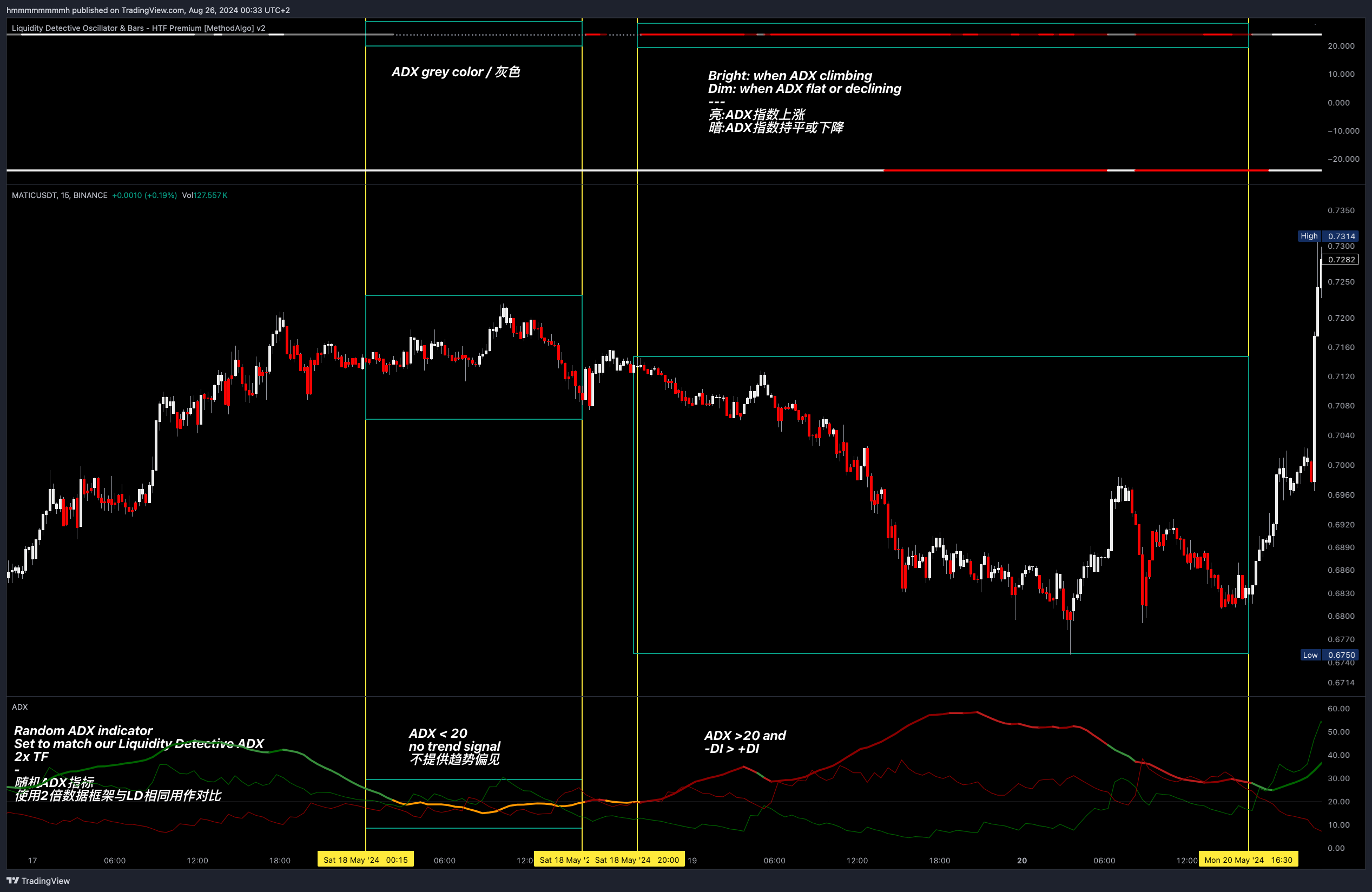 ADX在亮色时,说明一方的交易量与价格走势相辅相成,交易量和趋势在短期内支持其顺势的方向。这意味着,选择在ADX线亮色时的时机顺势入场,相对于对手色,和灰色,可减少入场后的波动浮亏