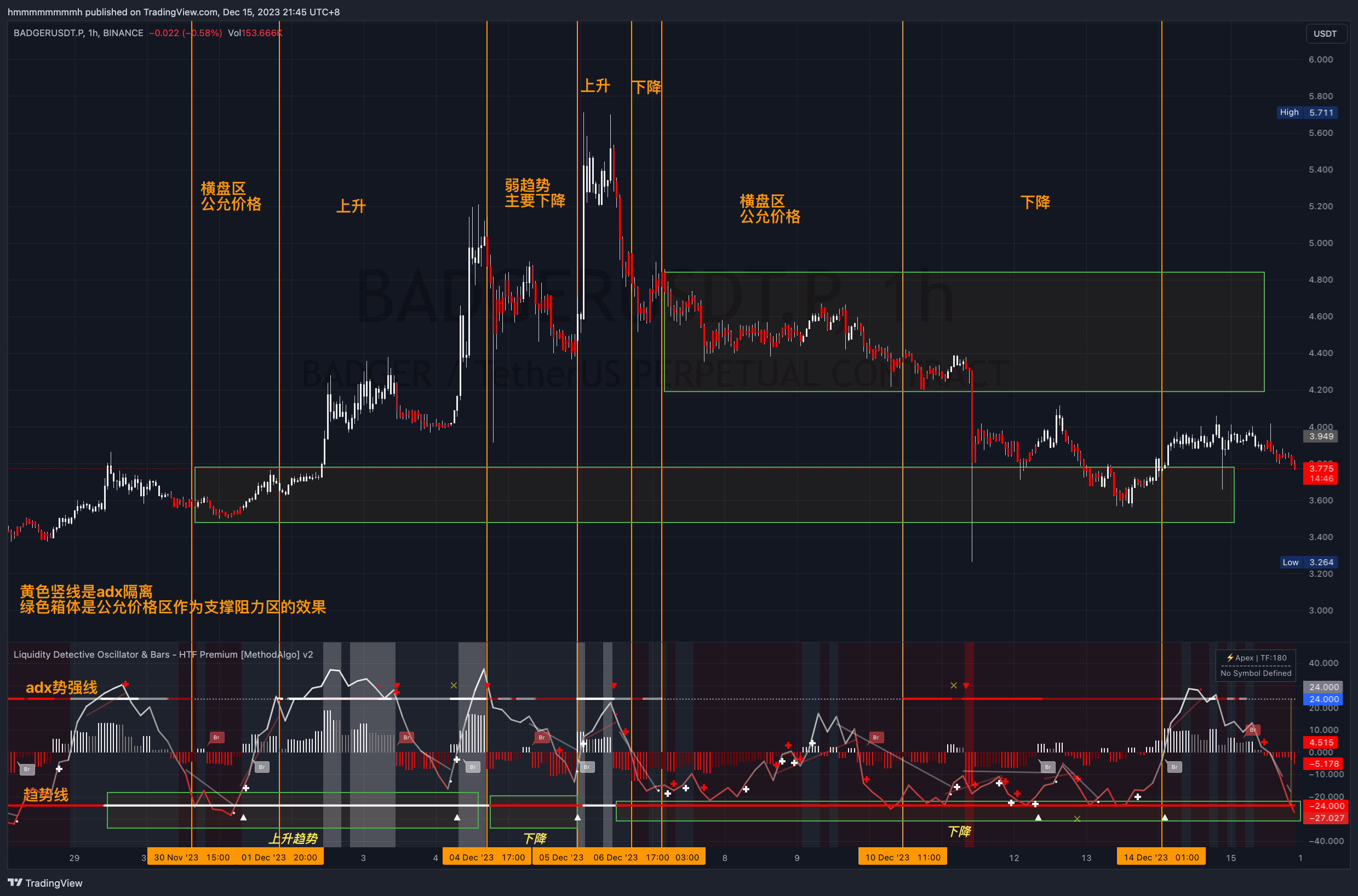 下图示例展示了流动性侦探已经帮你计算了ADX给出的各种信号,并通过颜色视觉化,且数据与ADX准确度相同