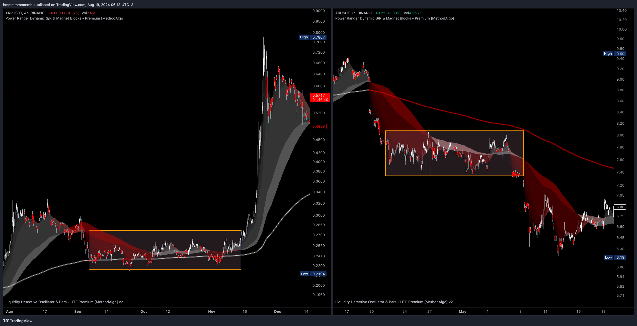 下图左侧图表的XRPUSDT是高压锅形态。右边图表ARUSDT非常相似,但非高压锅形态,因为缺少了在趋势线穿梭的条件,所以它只算一个熊旗与出货区域,是黄金坑形态