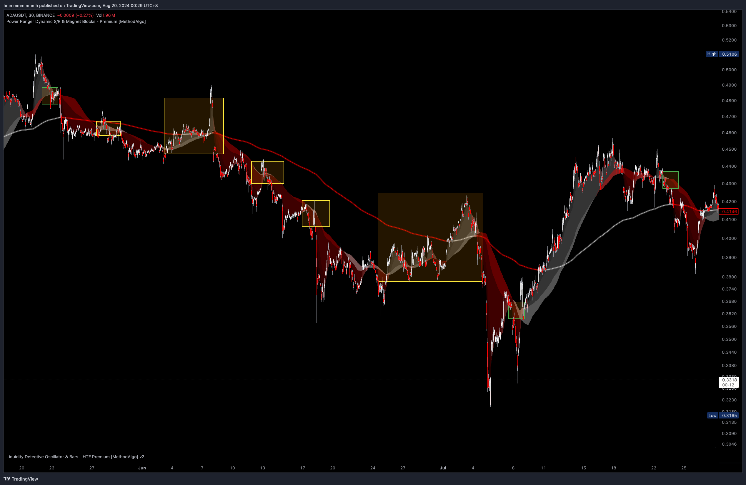 下图的ADAUSDT即是比较模糊的例子,形态模糊是因为云比较瘦,且爬升趋势并不算特别强势。其中,绿色框标注是符合辨别条件的反转云的开始,黄色框标注是黄金坑形态与黄金坑形态的复位