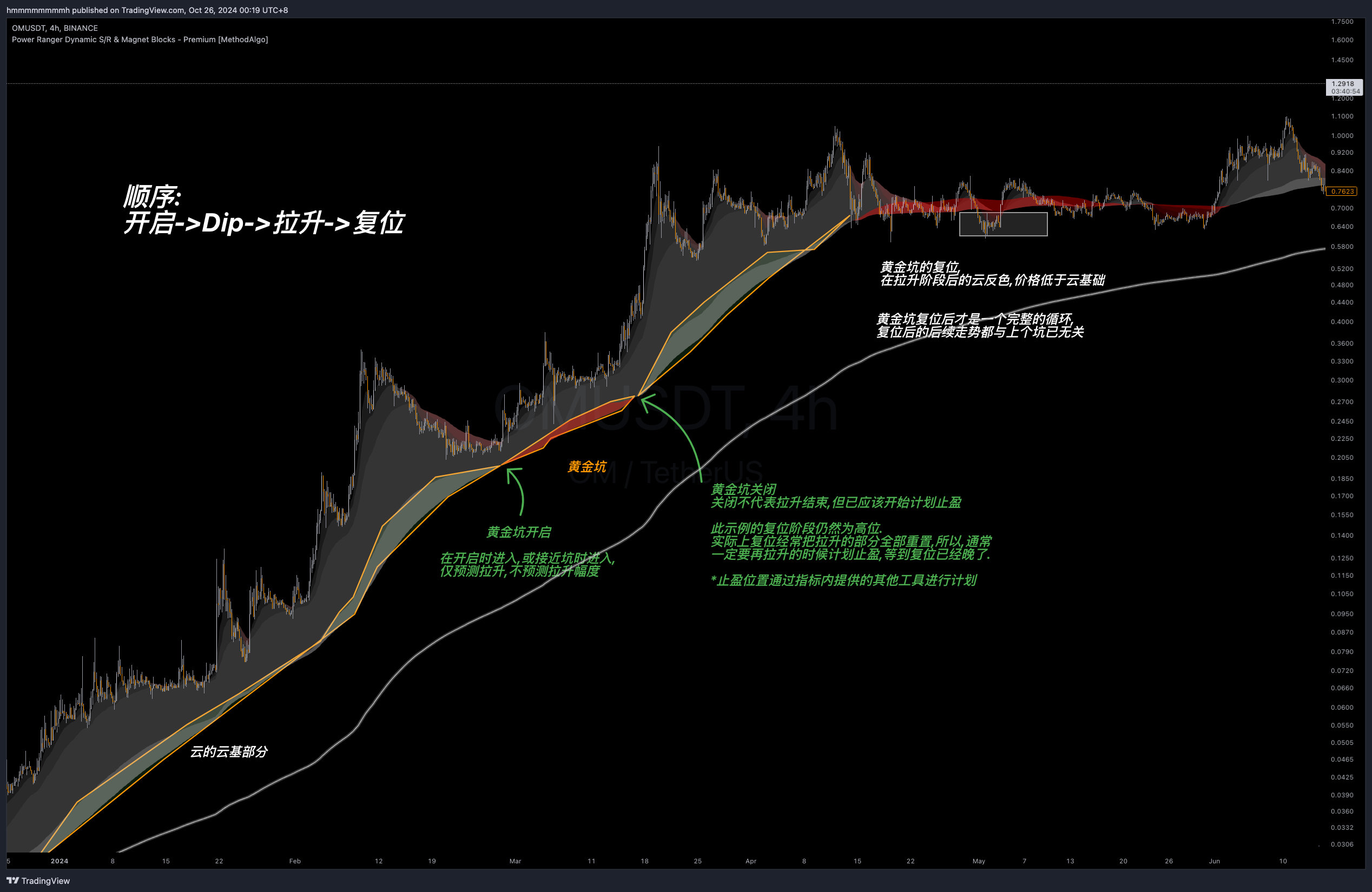 - 黄金坑:在出现黄金坑时,优质的入场范围是云基反色的区域,通常市场都会给机会,但有时,市场没有回撤到云基即开始拉升/拉跌并关闭黄金坑。爬升趋势中第一个黄金坑最好做,第二个开始,成功率逐渐降低(可能无法关闭直接变为反转云)