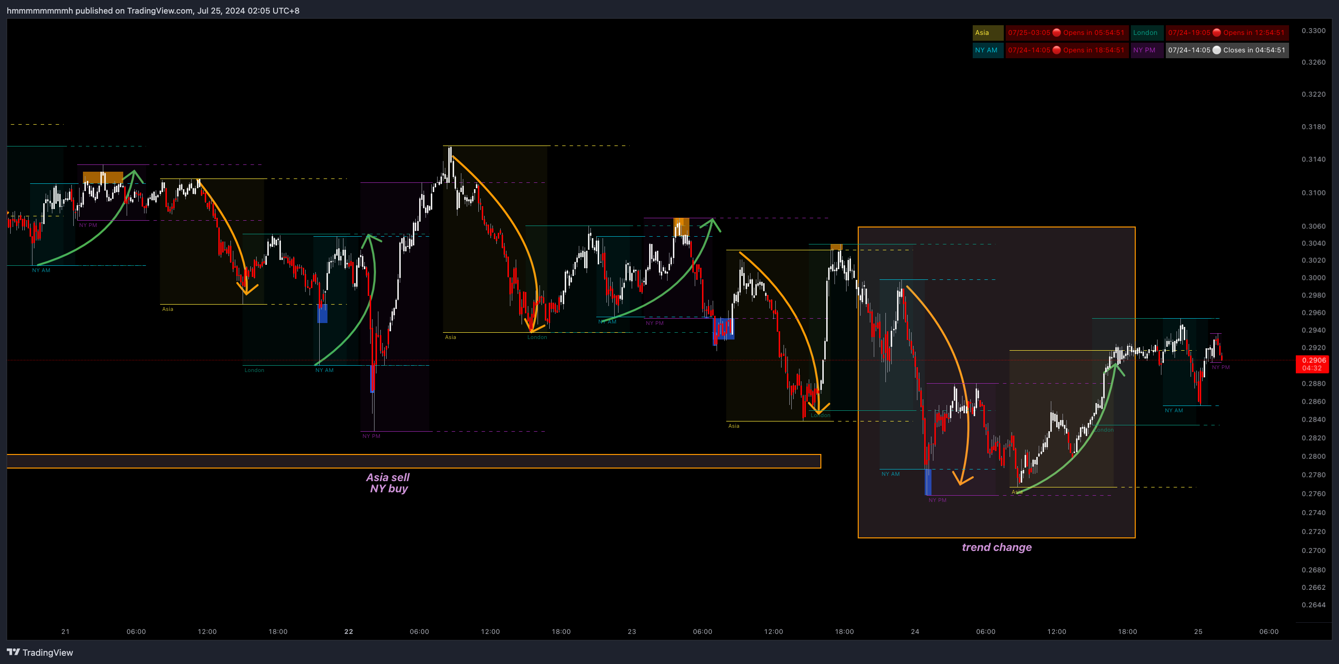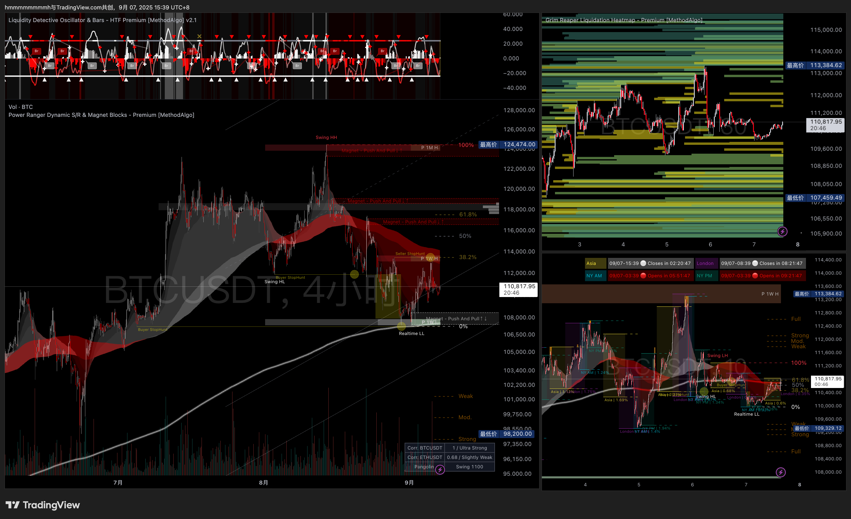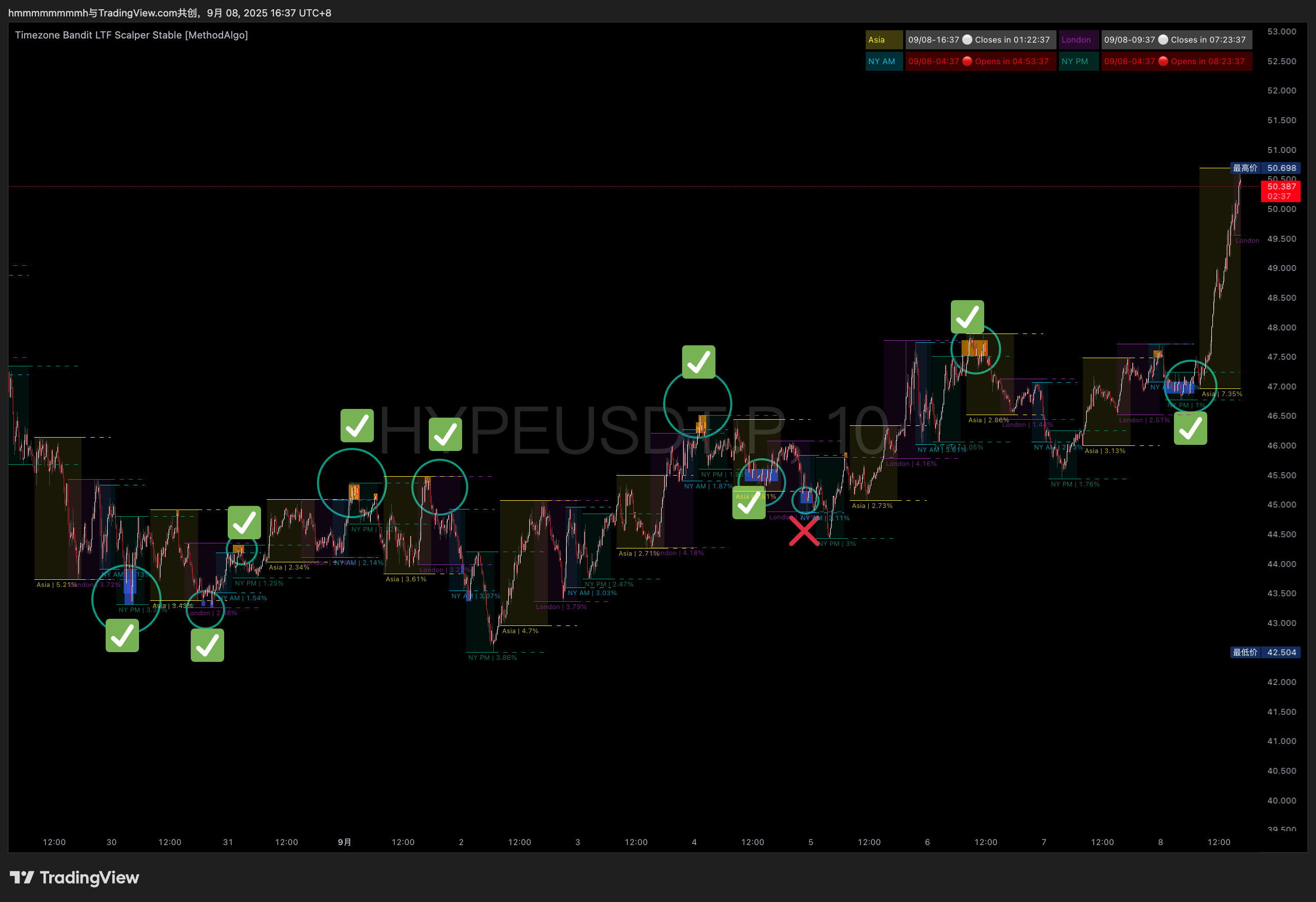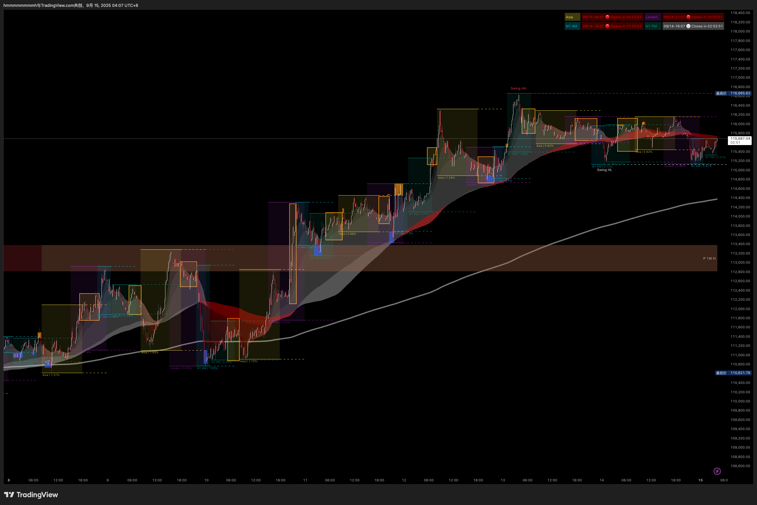 加密货币市场与外汇市场一样,具有24小时不间断交易和显著的时区特性。MethodAlgo的时区劫匪(Timezone Bandit)指标正是基于时间这一核心参数开发的。全球四大重要交易时区(亚洲、伦敦、纽约、盘后)的价格行为往往呈现出明显的规律性和可分析性。